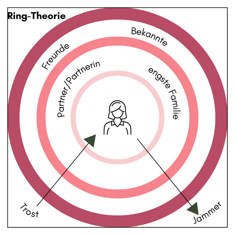 - Die „Ring-Theorie“*: Stell dir dich selbst im Zentrum eines Kreises vor. Im nächsten Ring sind Partner und engste Familie, dann Freunde, dann Bekannte. Die Regel ist einfach: Trost fließt nach innen (zu dir), Jammer und Klage fließen nach außen. Du musst niemanden trösten, der weiter außen steht als du selbst.